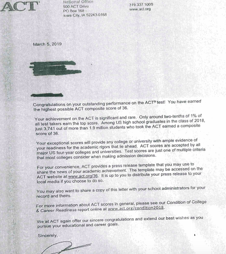 When scores came out, the student was overjoyed to receive the letter shown here.